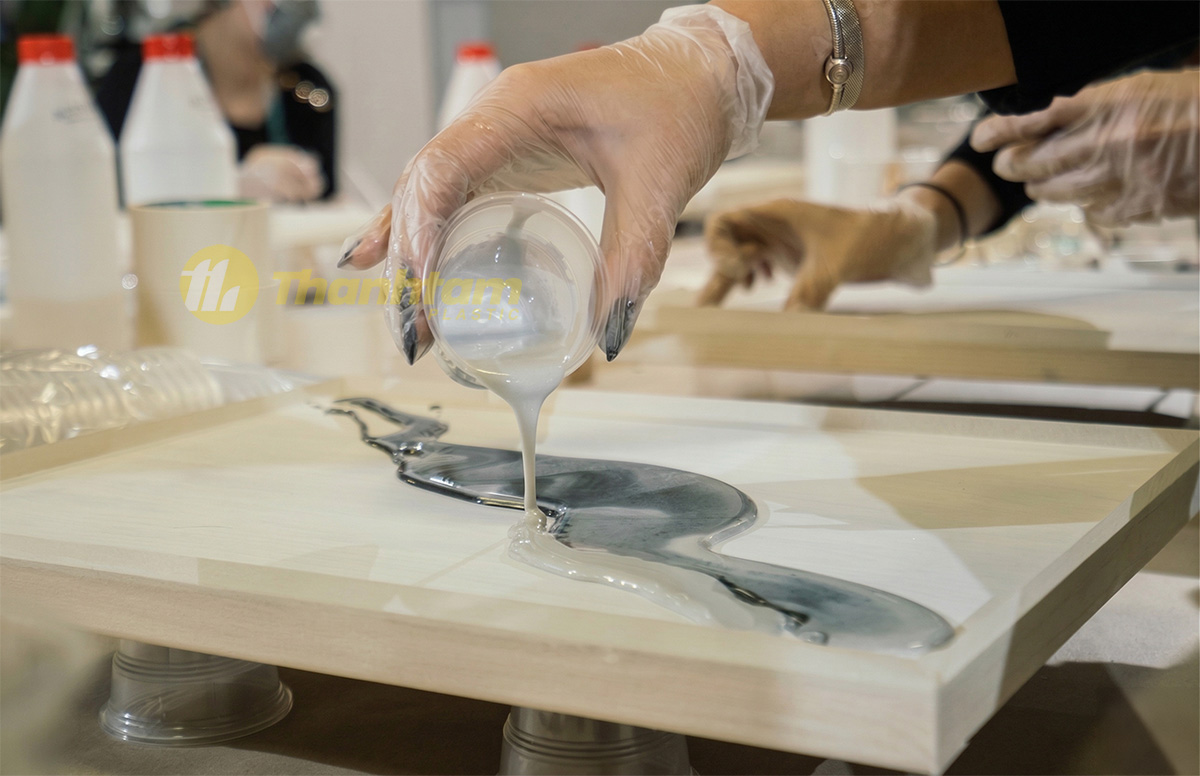 Trong đó, Epoxy Resin là dòng phổ biến nhất nhờ độ trong suốt cao và khả năng đóng rắn tạo bề mặt cứng chắc. Loại này thường được ứng dụng trong đổ khuôn trang sức, làm mặt bàn gỗ nghệ thuật hoặc phủ bóng tranh, đặc biệt rất được ưa chuộng trên các nền tảng thương mại điện tử.