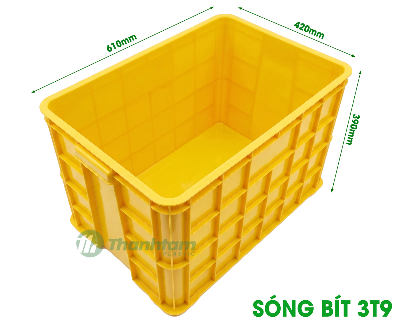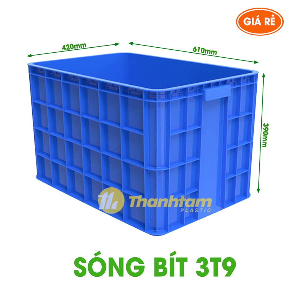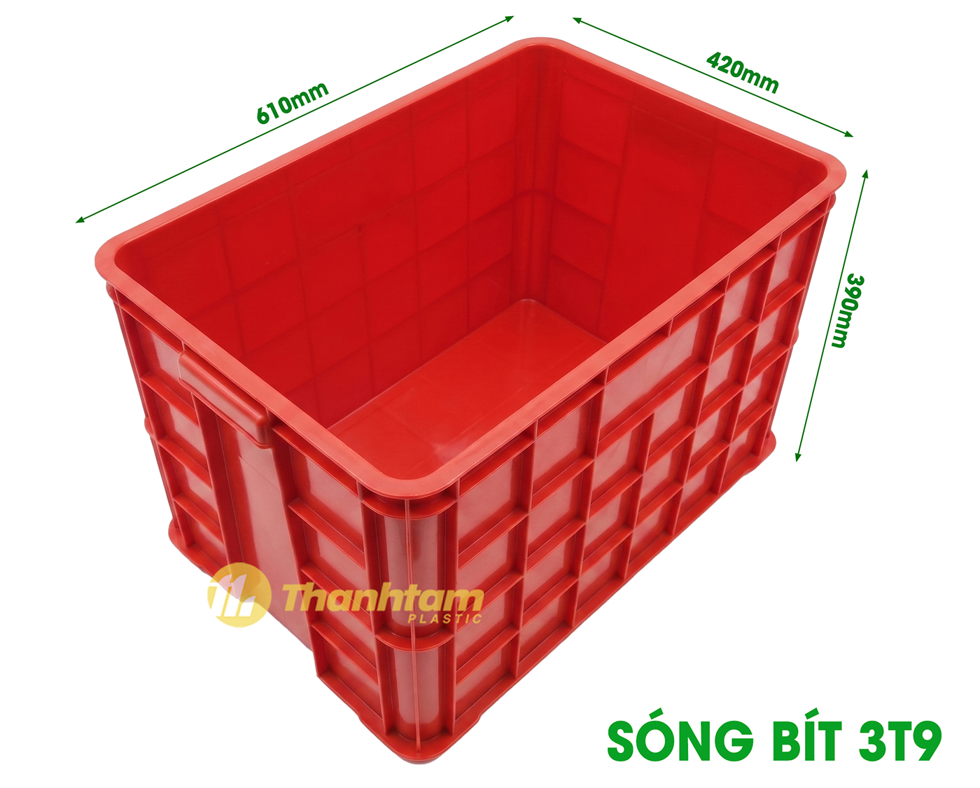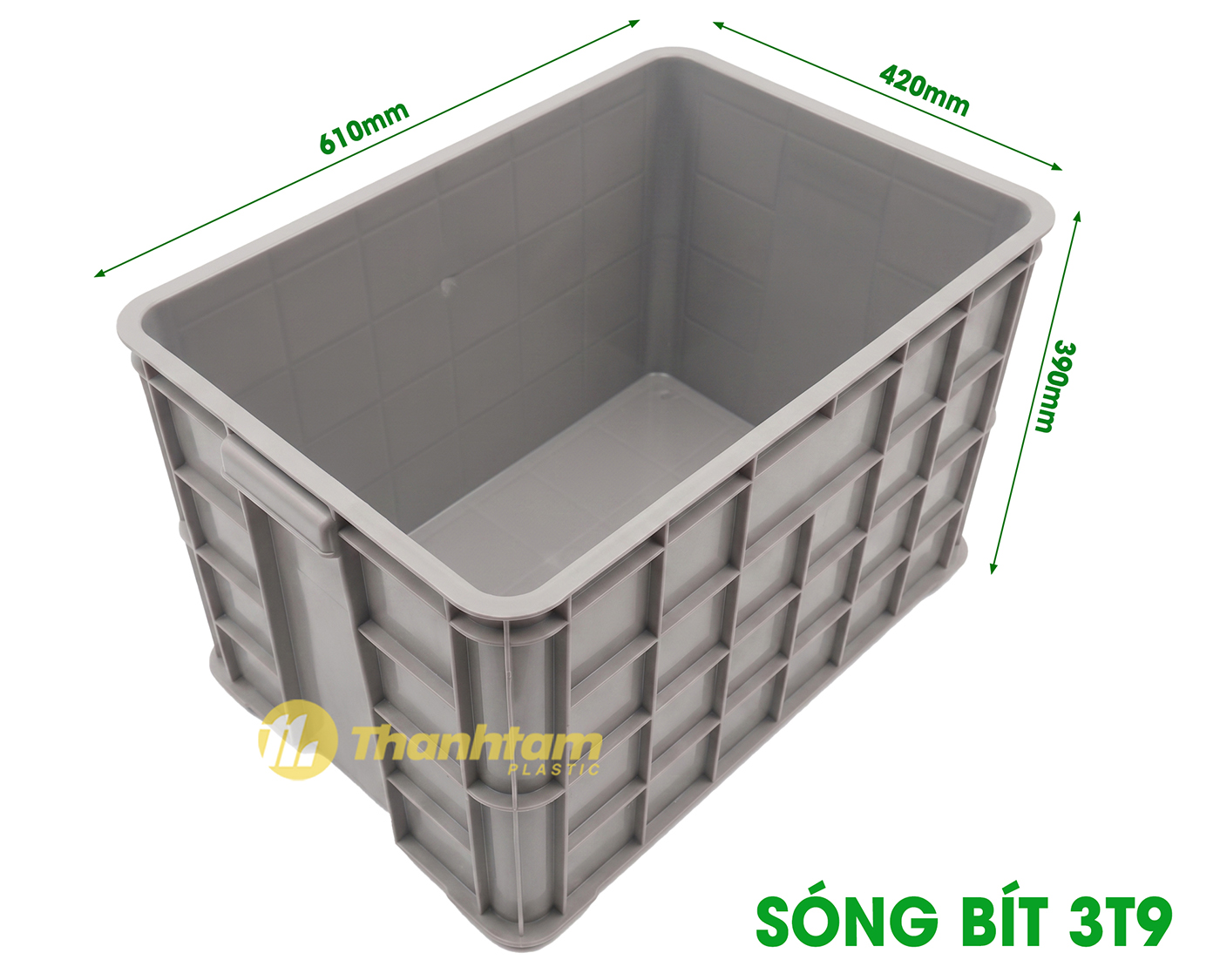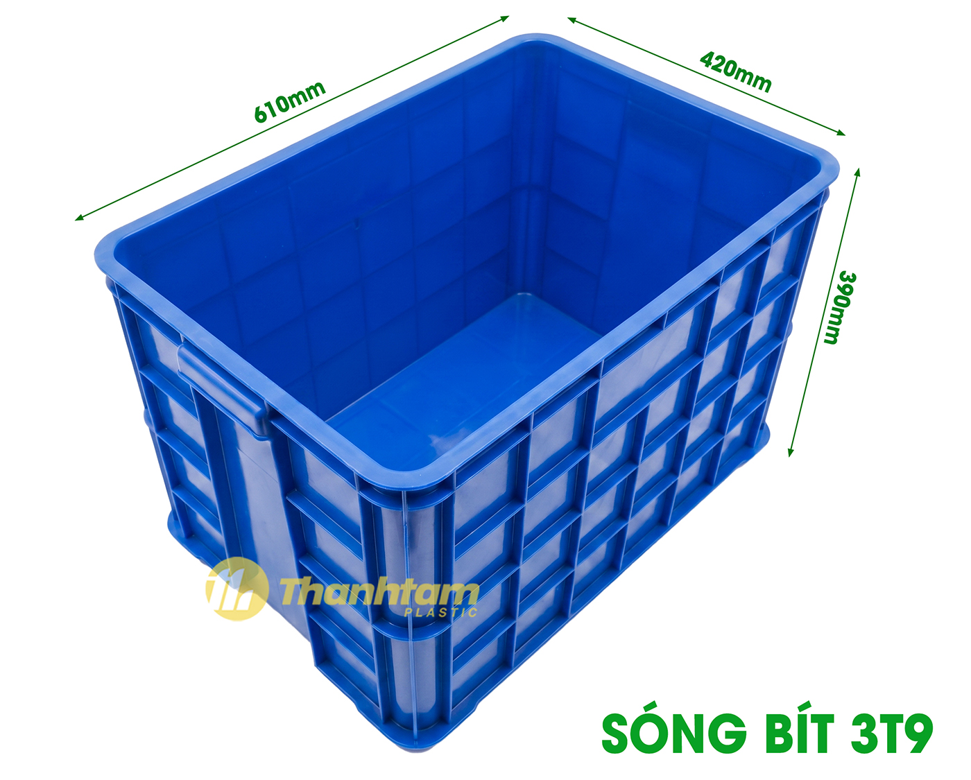 Sóng nhựa bít 3T9 còn gọi là thùng nhựa bít 3T9 hay thùng nhựa lớn cao 39cm. Dùng để đựng và vận chuyển thực phẩm như Bánh bao, Bánh trung thu, trái cây, thủy hải sản, nông sản. Được sản xuất từ nhựa HDPE nguyên sinh cao cấp, bền bỉ, chịu được va đập mạnh và an toàn cho sức khỏe người sử dụng với thiết kế và kiểu dáng hiện đại, tiện lợi, đáp ứng mọi nhu cầu của quý khách hàng.