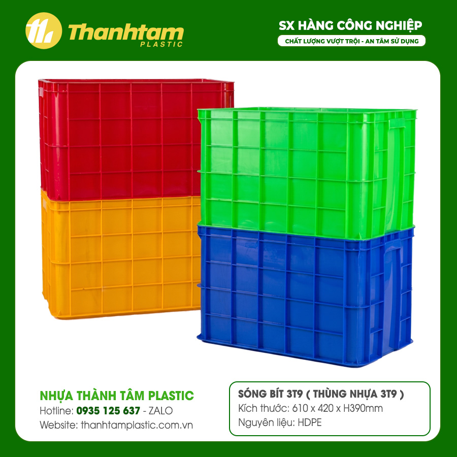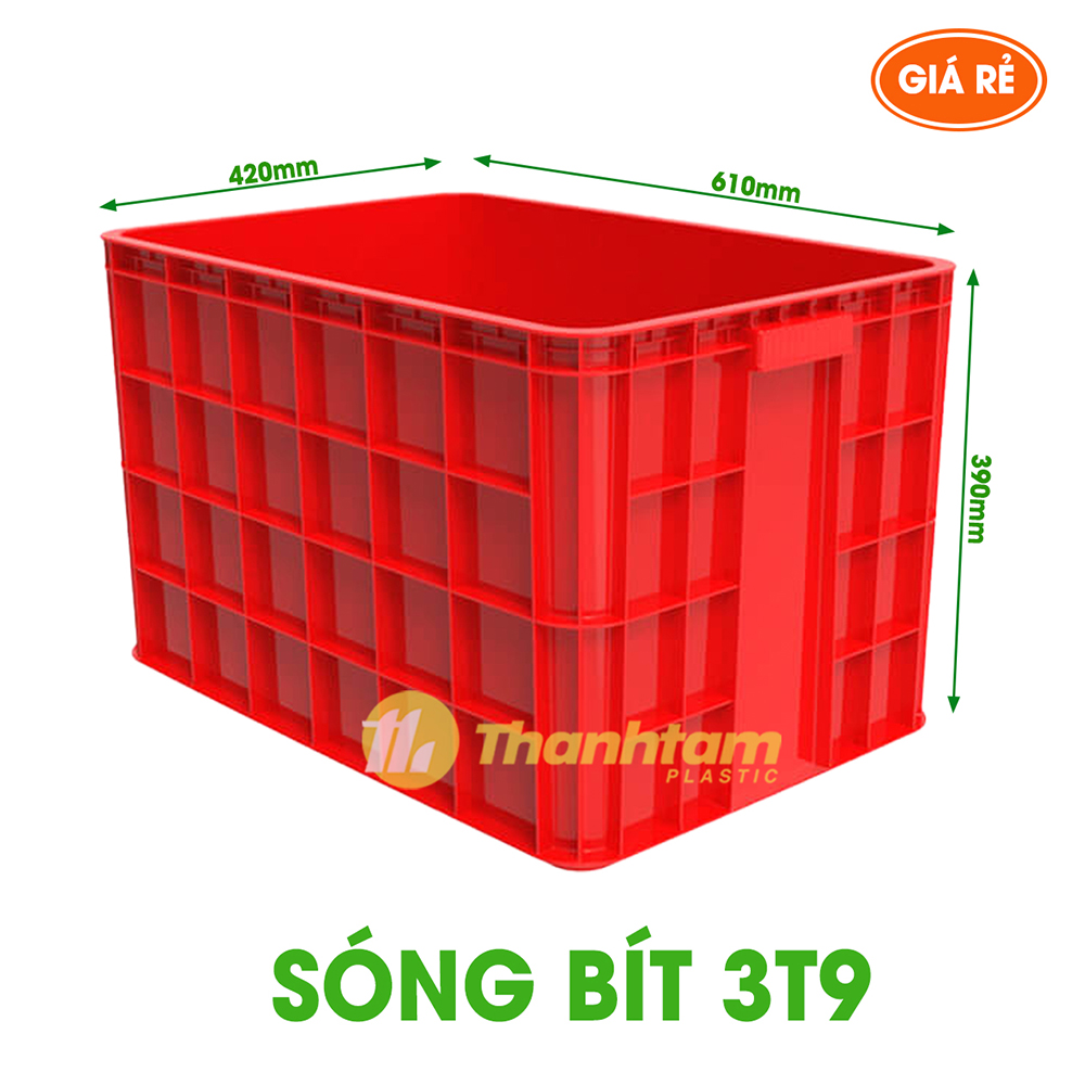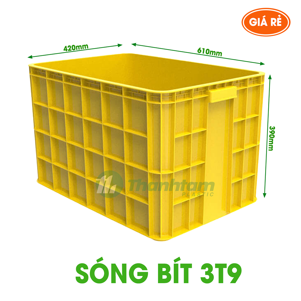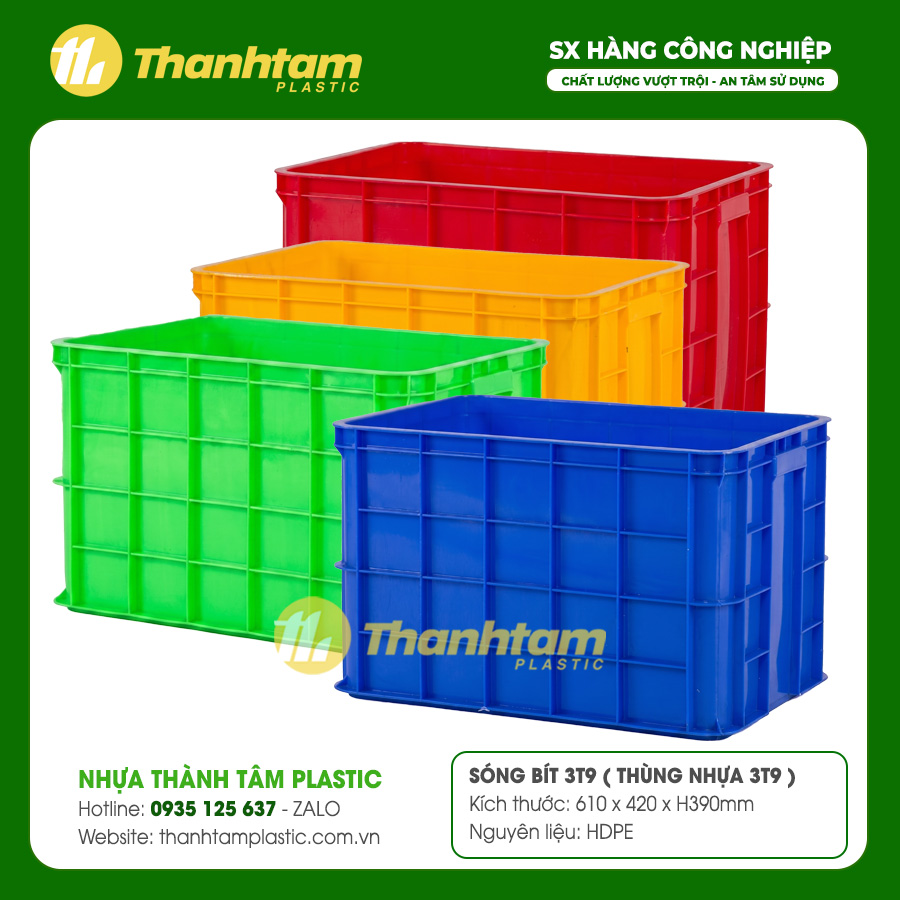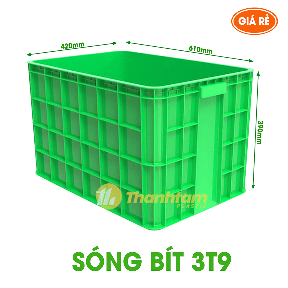 Sóng nhựa bít 3T9 còn gọi là thùng nhựa bít 3T9 hay thùng nhựa lớn cao 39cm. Dùng để đựng và vận chuyển thực phẩm như Bánh bao, Bánh trung thu, trái cây, thủy hải sản, nông sản. Được sản xuất từ nhựa HDPE nguyên sinh cao cấp, bền bỉ, chịu được va đập mạnh và an toàn cho sức khỏe người sử dụng với thiết kế và kiểu dáng hiện đại, tiện lợi, đáp ứng mọi nhu cầu của quý khách hàng.
