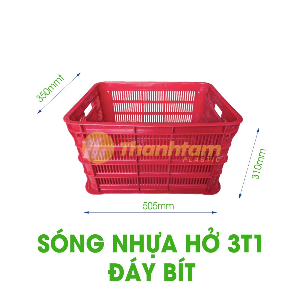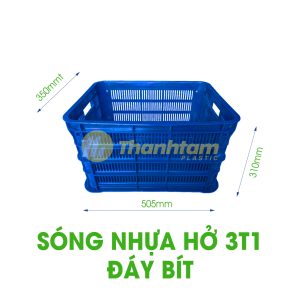 Sóng nhựa hở 3T1 đáy bít là một trong những dòng sản phẩm thùng nhựa công nghiệp được thiết kế với phần thành hở giúp thoáng khí và đáy kín hoàn toàn để giữ hàng hóa không rơi rớt. Với kích thước tiêu chuẩn 505 x 350 x 310mm, sản phẩm phù hợp sử dụng trong nhiều lĩnh vực như nông sản, linh kiện điện tử, phụ tùng,… Được sản xuất từ nhựa HDPE nguyên sinh, sóng nhựa 3T1 đáy bít đảm bảo độ bền, chịu lực tốt và thân thiện với môi trường.