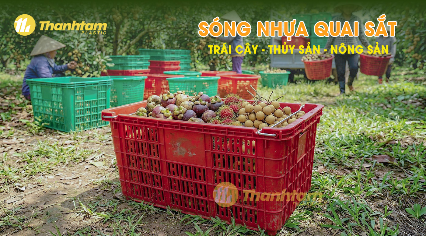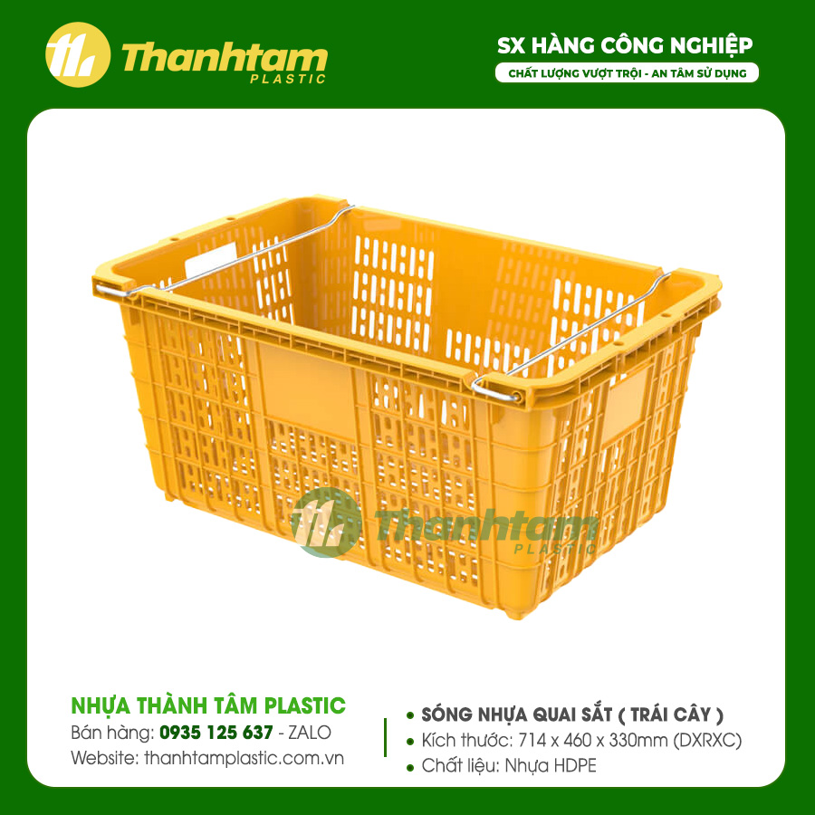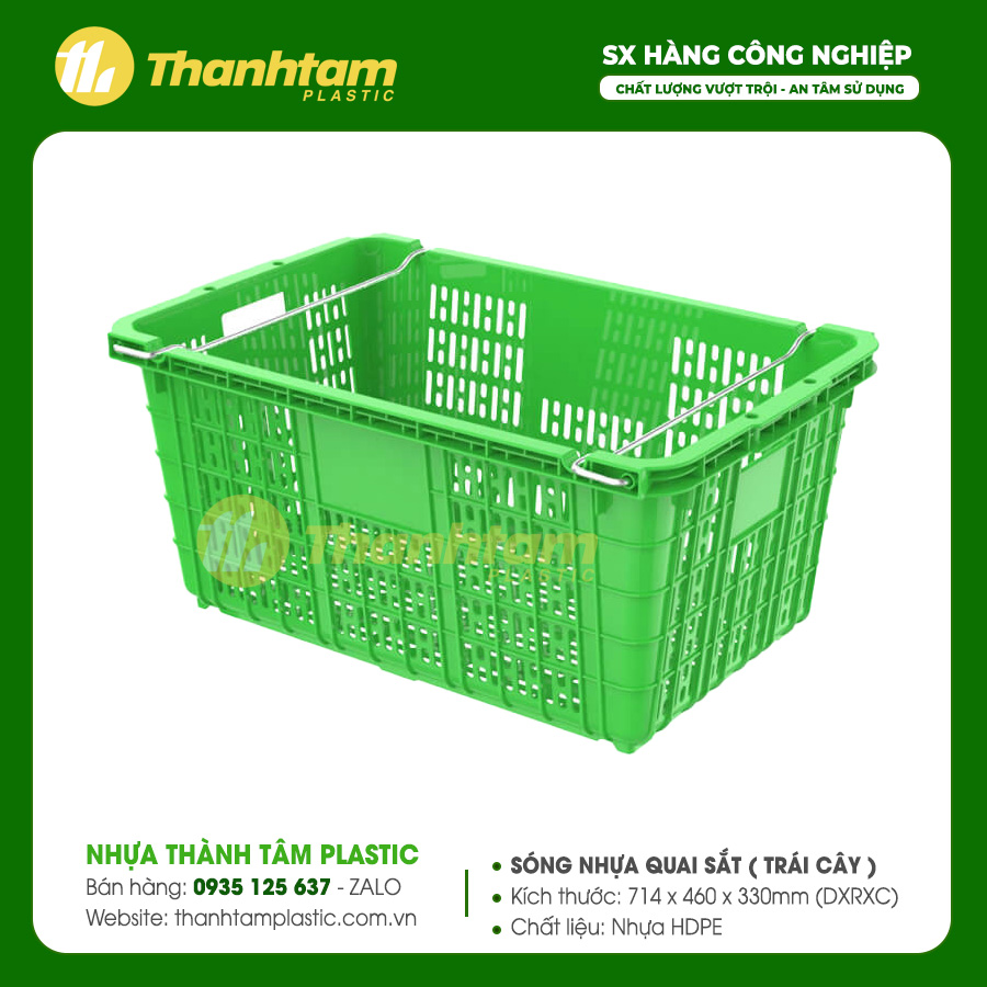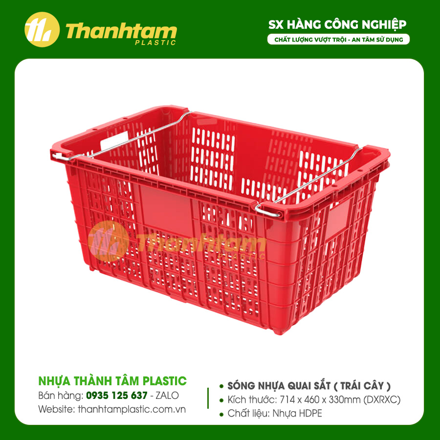 Sóng nhựa quai sắt đựng trái cây, còn được gọi là sọt nhựa đựng trái cây hoặc rổ nhựa đựng trái cây, là dòng sản phẩm nhựa công nghiệp có thiết kế khác biệt so với các loại thông thường. Sản phẩm được trang bị quai sắt ở hai bên tay cầm, giúp việc cầm nắm và di chuyển hàng hóa trở nên dễ dàng, an toàn, không gây tổn thương cho người sử dụng.